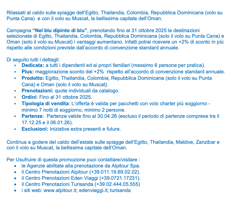 Gli Utenti Convenzionati possono prenotare i viaggi e i soggiorni fruendo della Convenzione Quadro Alpitour solo previa registrazione e attivazione del codice sconto presso l’area riservata nel seguente sito https://www.alpitour.it/.