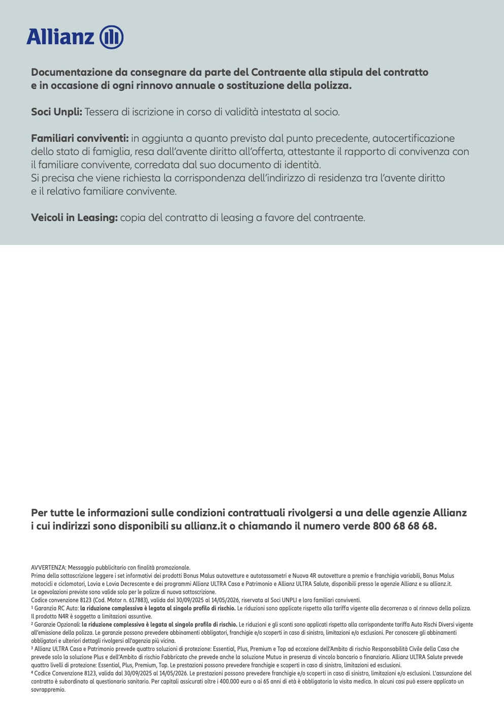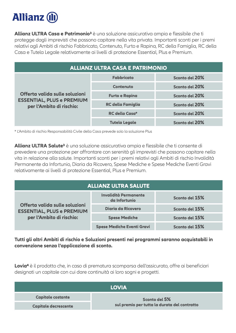 Sono disponibili due formule pensate per le necessità di tutta la tua famiglia: Allianz ULTRA Casa e Patrimonio e Allianz ULTRA Salute.