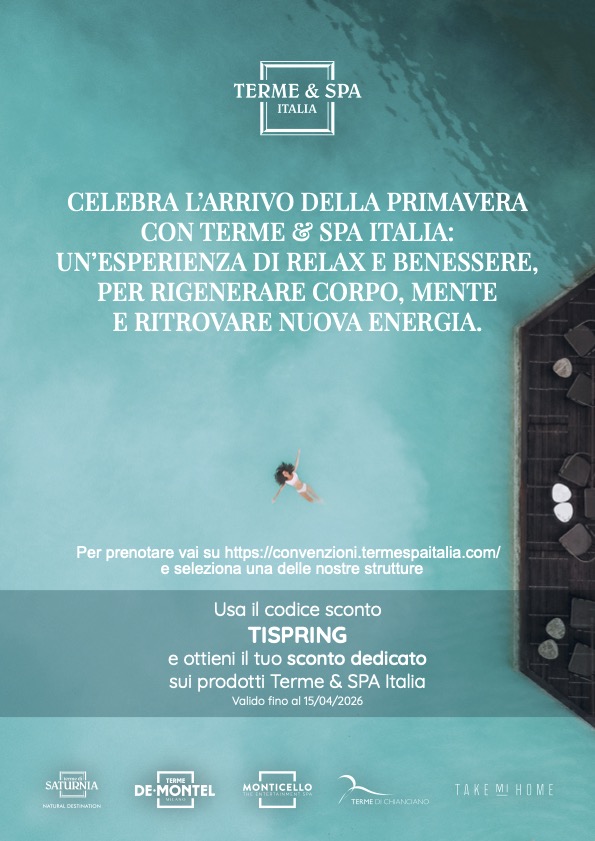 Per i Soci pro Loco in possesso della Tessera annuale c’è un ulteriore sconto sui prodotti Terme & Spa utilizzando il codice TISPRING e presentando la Tessera annuale all’ingresso delle terme.