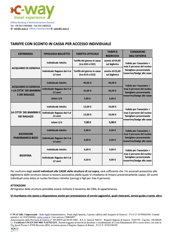 TARIFFE PER PREACQUISTO STOCK DI BIGLIETTI O INGRESSI DI GRUPPO TARIFFE CON SCONTO IN CASSA PER ACCESSO INDIVIDUALE TARIFFE PREACQUISTO